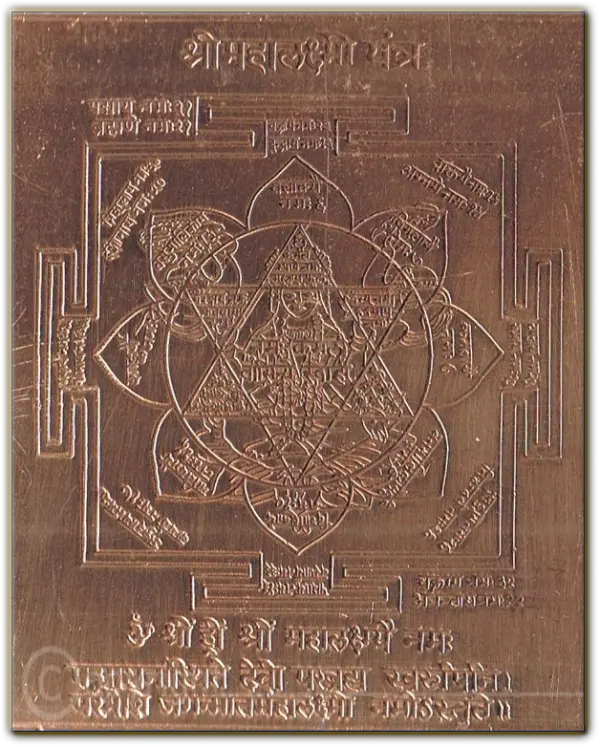 ...Von Lakshmi heißt es, dass sie nie lange an einem Ort verweilt und sich nicht halten lässt. Will man sie mit Gewalt besitzen und festhalten, so verlässt sie den Übeltäter sofort. ...Der dritte Tag des in Indien überaus populären Diwali- oder Lichterfestes ist der Göttin Lakshmi geweiht, bei dem man ihr zu Ehren Tausende von Laternen und Kerzen anzündet, Feuerwerkskörper abbrennt und die Häuser hell erleuchtet. Man spielt und feiert, während die Göttin von Haus zu Haus wandert, um einen Rastplatz zu finden. Sie komme aber nur in die hell erleuchteten Wohnstätten und bringe ihnen Glück fürs kommende Jahr. Dabei wird Lakshmi besonders von den Kaufleuten und Händlern verehrt. Im Dorf wird ein Misthaufen oder ein Haufen aus Kuhdung als Lakshmi gepriesen. ...Diwali beginnt immer am fünfzehnten Tag des Hindumonats Kartik (Ende Oktober/Anfang November), Lakshmi Yantra aus Kupfer ca. 8 x 10 cm