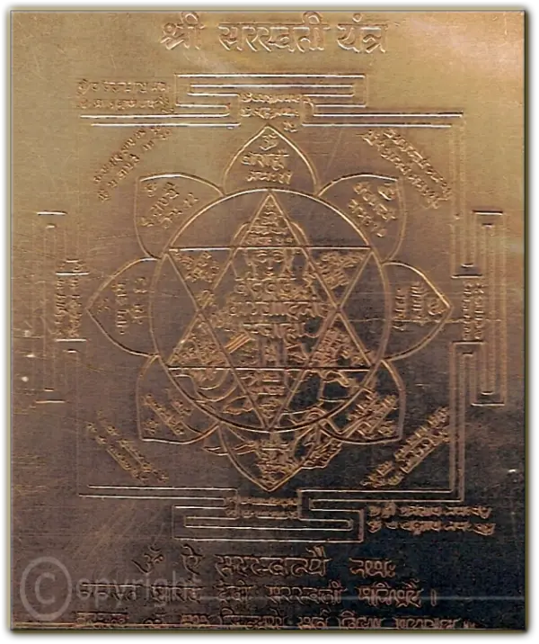 Für Schüler oder auch Erwachsene, die sich bilden und weiterbilden wollen kann ein Saraswati-Yantra in der Nähe oder auf dem Schreibtisch die Gedanken wieder "in Fluss" bringen. Sarasvati Yantra, indisch, Kupfer Astrologische Bedeutung und Zuordnung: Sternzeichen Wassermann, Planeten Uranus, Neptun https://de.wikipedia.org/wiki/Sarasvati Sarasvati (Sanskrit, f., सरस्वती, Sarasvatī, „die Fließende"[1]), ist eine indische Göttin der Weisheit und Gelehrsamkeit und eine der populärsten hinduistischen Göttinnen. ...Als Vac („Wort", „Logos"), so ein anderer Name, verkörpert sie das personifizierte Wort, die perfekte Rede....Sarasvati ist die Göttin des Lernens, der Sprache, der Wissenschaften, der Künste, der Dichtung, der Literatur, der Schrift, der Weisheit, des Tanzes, des Gesanges und der Musik.[3] Sie gilt als „Mutter der Veden", Erfinderin des Sanskrit-Alphabets und der Devanagari-Schrift.[5] Sie wird besonders von Schulkindern, Studenten, Philosophen und Intellektuellen verehrt. ...Ursprünglich war sie als Natur- und Flussgöttin beschrieben, daher bringt man sie auch heute noch mit reinem Wasser, und dem mythischen Soma in Verbindung. Sie verkörperte den heiligen Fluss Sarasvati, der seinen Ursprung im Himmel gehabt haben und durch alle drei Welten (Triloka) verlaufen sein soll, der heute ausgetrocknet ist und war in erster Linie eine Göttin der Fruchtbarkeit..Der wichtigste Feiertag der Göttin, Vasant Panchami, auch Sarasvati Puja genannt, findet im Frühjahr statt. In Schulen und Universitäten stellen Hindus Bilder der Göttin auf, davor Bücher, Schreibzeug und Musikinstrumente, und verehren darin die Göttin. Ihr, der Schutzpatronin des Lernens, wird besonders vor Klausuren, wichtigen Prüfungen und dem Schulunterricht geopfert. Den ganzen Tag über gibt es kulturelle Programme und Prozessionen. Im Süden Indiens ehrt man Sarasvati besonders im Herbst zu Navaratri, während in anderen Landesteilen die Göttin in Form von Durga im Zentrum der Anbetung steht.[https://de.wikipedia.org/wiki/Vasant_Panchami...Die Bedeutung von Hindu-Festen ist häufig mit den Jahreszeiten verflochten. Ein besonders prägnantes Beispiel dafür ist Vasant Panchami, das den Beginn des Frühlings (Vasant) markiert. Am fünften Tag (Panchami) des Hindumonats Magha (nach modernem Kalender Januar/Februar) Sarasvati Yantra aus Kupfer ca. 8 x 10 cm